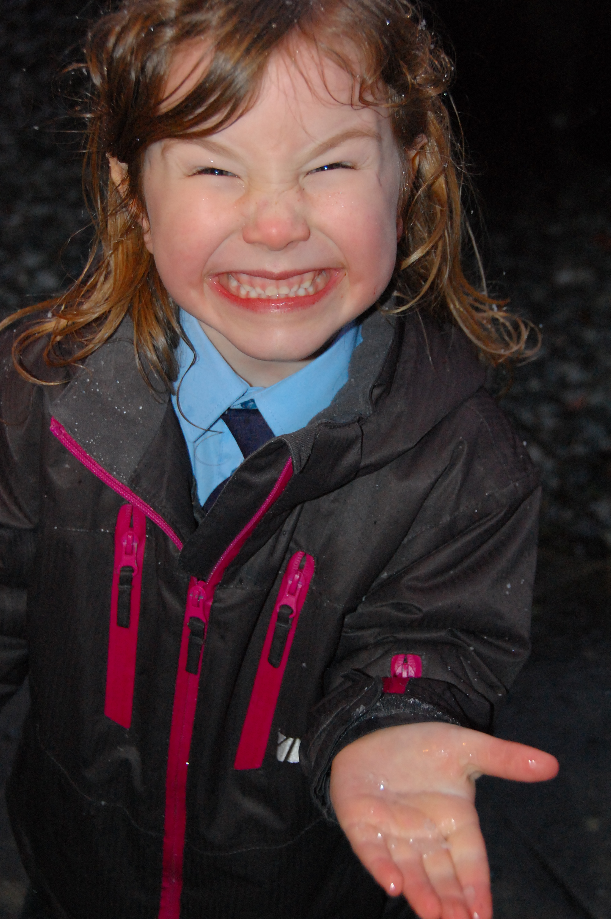 We’ve been fairly lucky with weather here really, it hasn’t stopped raining and the wind has been fairly bad, nothing like elsewhere in the country though. On Tuesday we had our 1st bit of snow fall. The munchkin was very excited about it. I’m trying not to say no, within reason, so when she asked if she could spend some time running around in the falling snow I said she could. She spent some time running around and twirling and catching the snow on her tongue and in her hands!