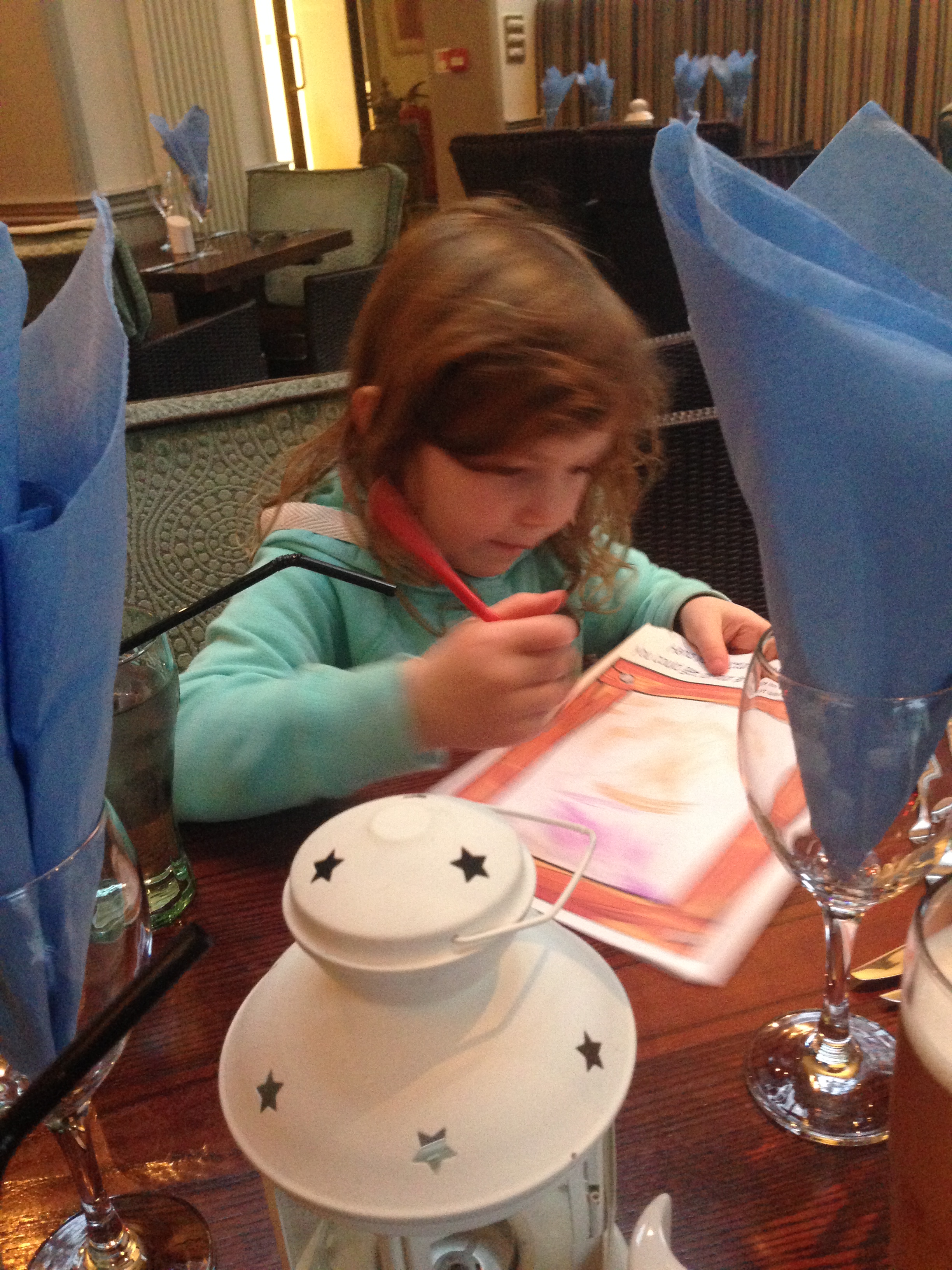 On Sunday after getting back from York and having an afternoon nap, I literally couldn’t keep my eyes open, I decided that rather than cook we would go out for Sunday tea! So we did. The place we had our wedding reception many years ago has a gorgeous restaurant so I decided we’d go there. Food was delicious and really reasonably priced, service was great too. The munchkin spent some time drawing a picture and doing a word search!