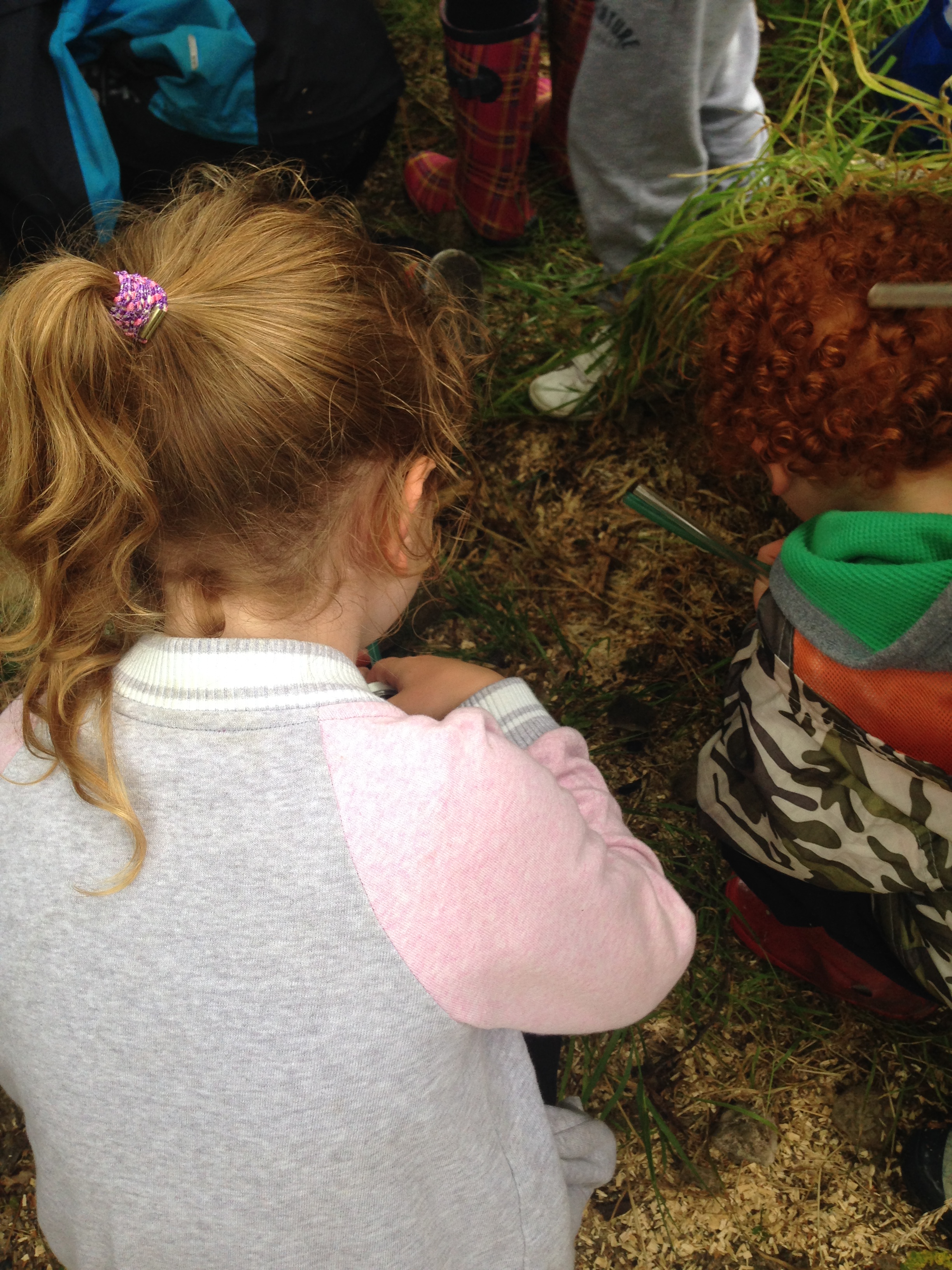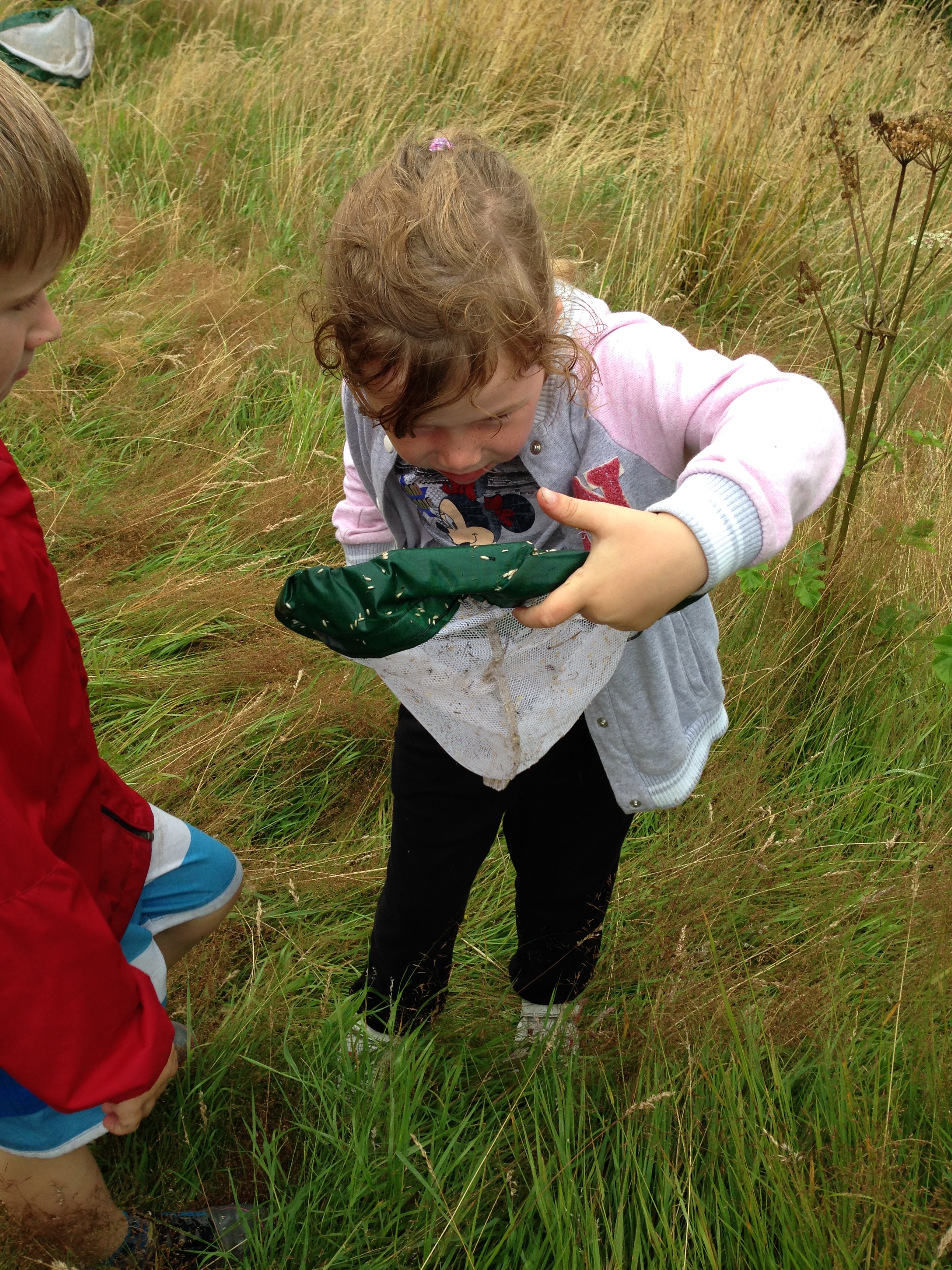 First we came to a wooded area and spent time looking under logs and looking in the leaves for tiny creepy crawlies. Each of the children had a pooter which gave them the ability to suck bugs up into a tub so they can have a closer look.