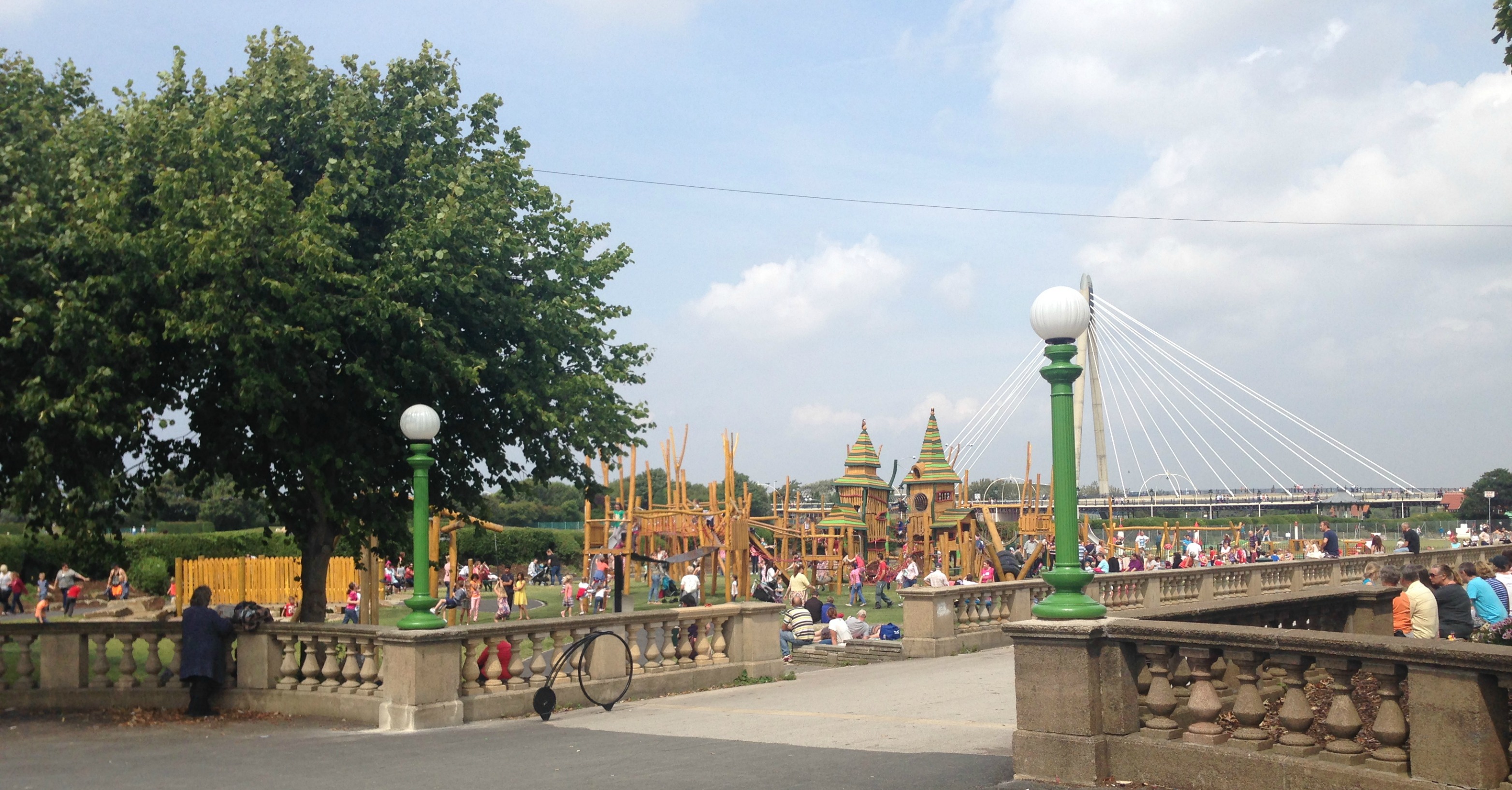 We could see the park we were aiming for across the lake, the munchkin was excited and walked the whole way round on a little stone wall, the path not being adventurous enough for her! We had to cross a bridge which meant negotiating some pretty steep steps with the froglets pram. There are other bridges with ramps but we passed them, I mean going up a ramp is just too easy for our leisurely stroll.