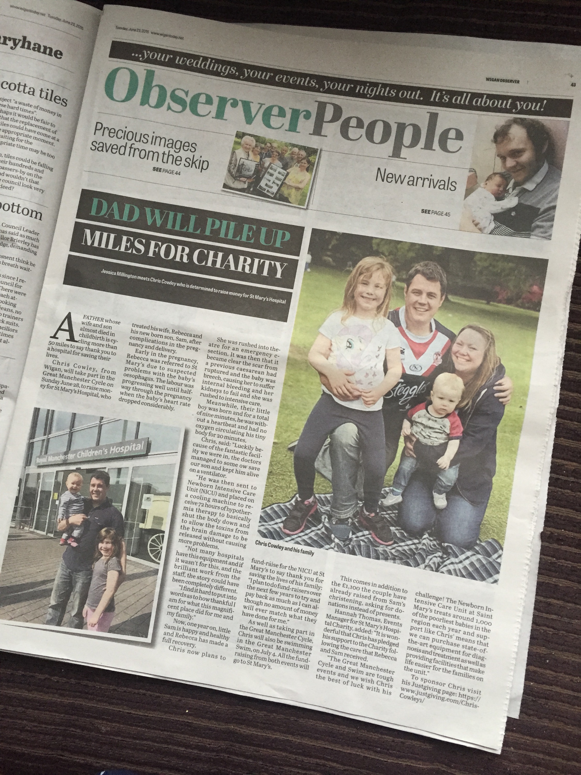 A day or two after the froglets first birthday Mr C, like me feeling a little emotional about the memories the day conjured, contacted St Marys Hospital Charity to see if there were any events coming up that he could take part in to raise money for them. The very same day he was signed up to do the Great Manchester Cycle, a 52 mile bike ride in Manchester on 28th June and then the Great Manchester Swim, a mile swim Dock to Dock in Salford Quays on the 4th July. St Mary’s Hospital Charity asked if they could use our story, basically to show a personal side as to why people are taking part in the events. This is the reason our story is out there!